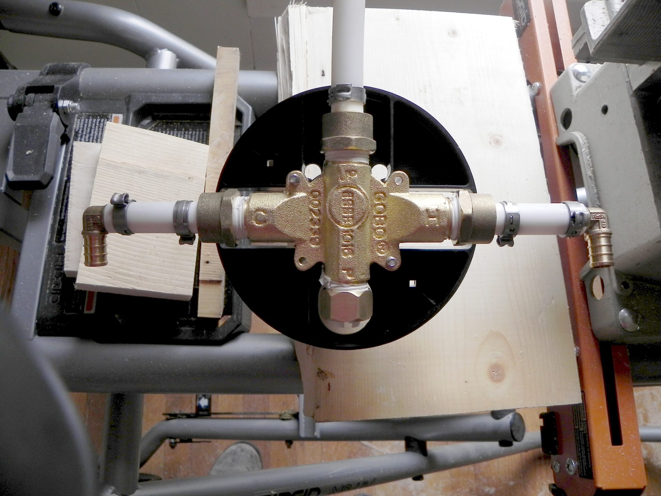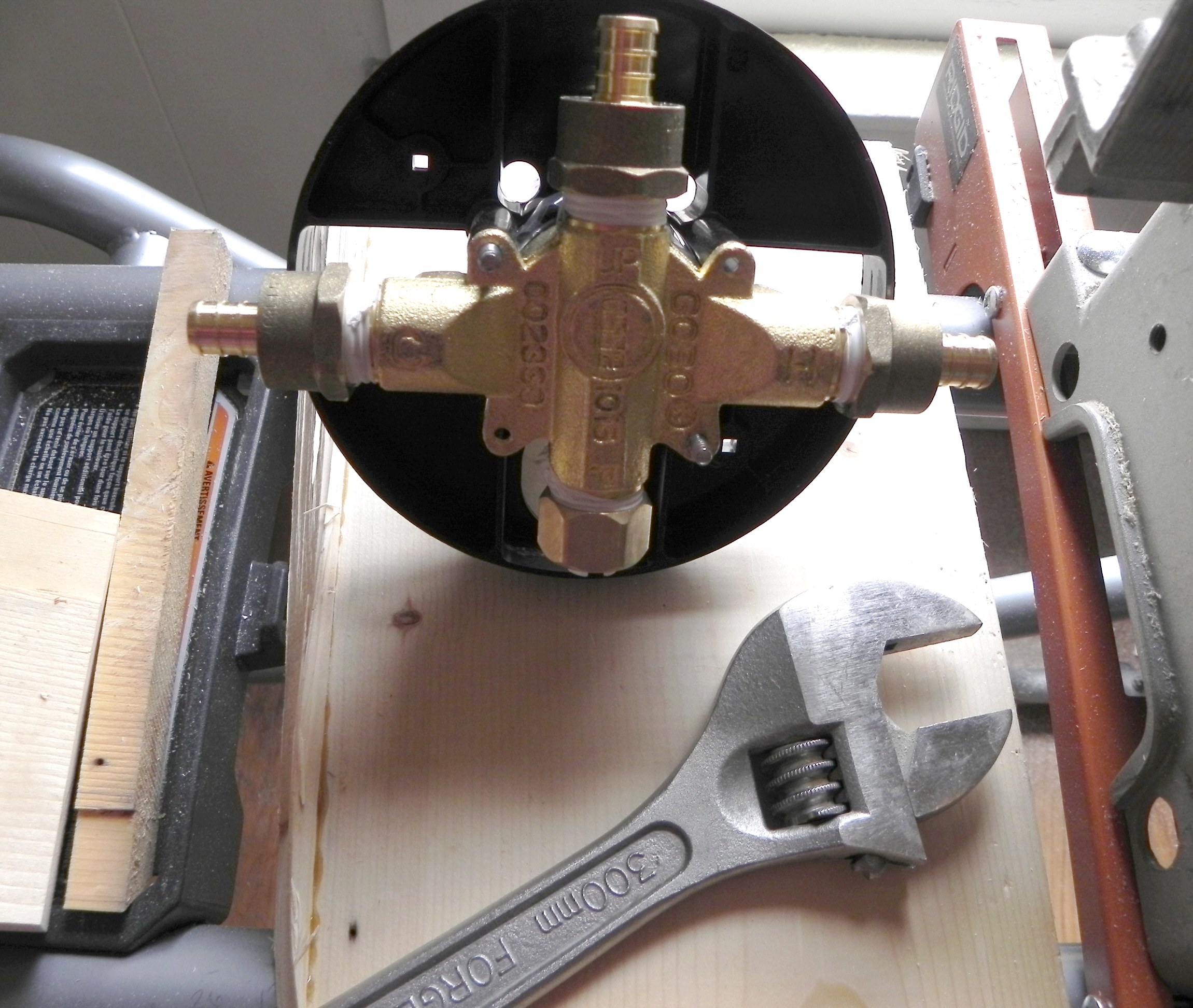Start by generously taping those 1/2″ MPT threads on the shower valve (8 loops of teflon tape), then screwing on some 1/2″ MPT to Pex adapters