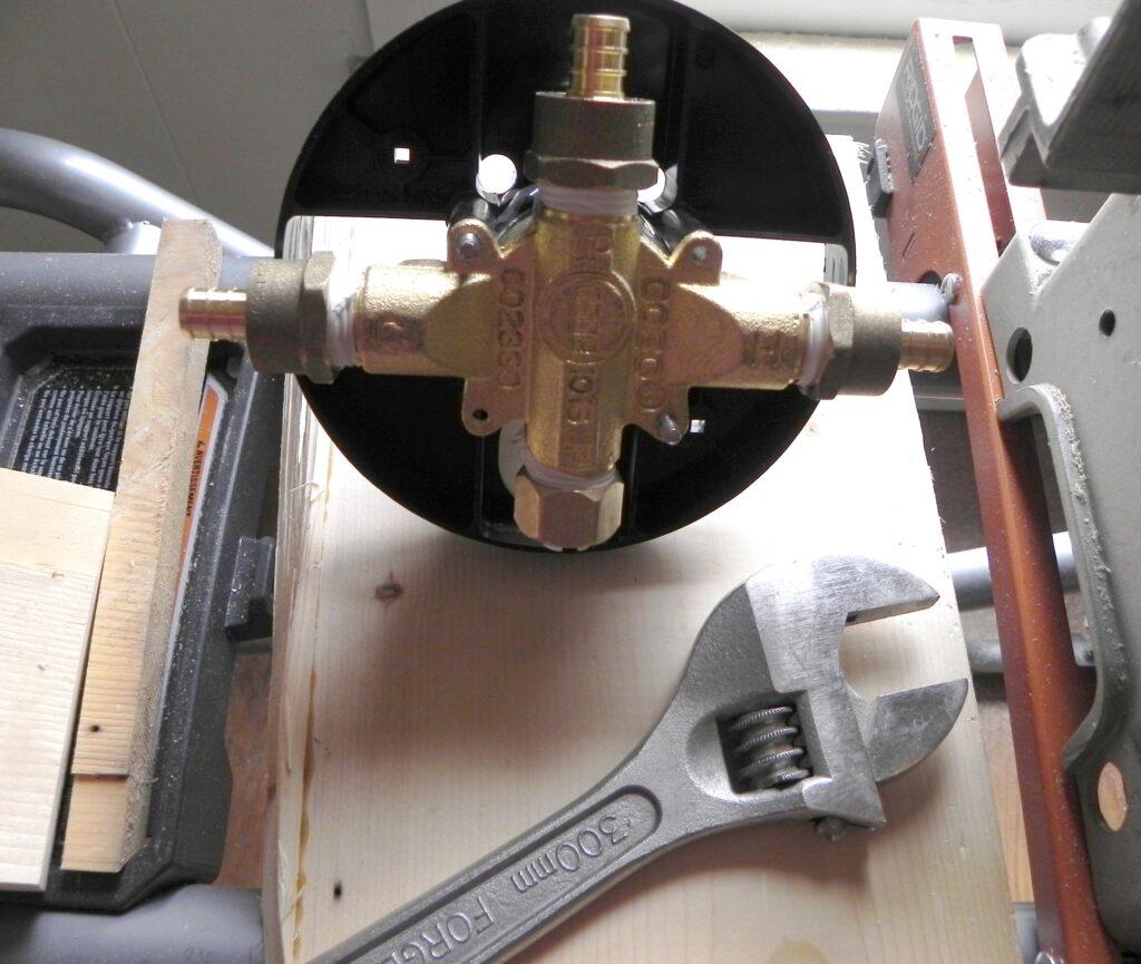 But as modern PEX plumbers, all we have to do is wrench on some 1/2″ female pipe thread adapters to the male connectors provided on virtually every shower valve. (Note that you add about 8 laps of teflon tape first to ensure a watertight connection).