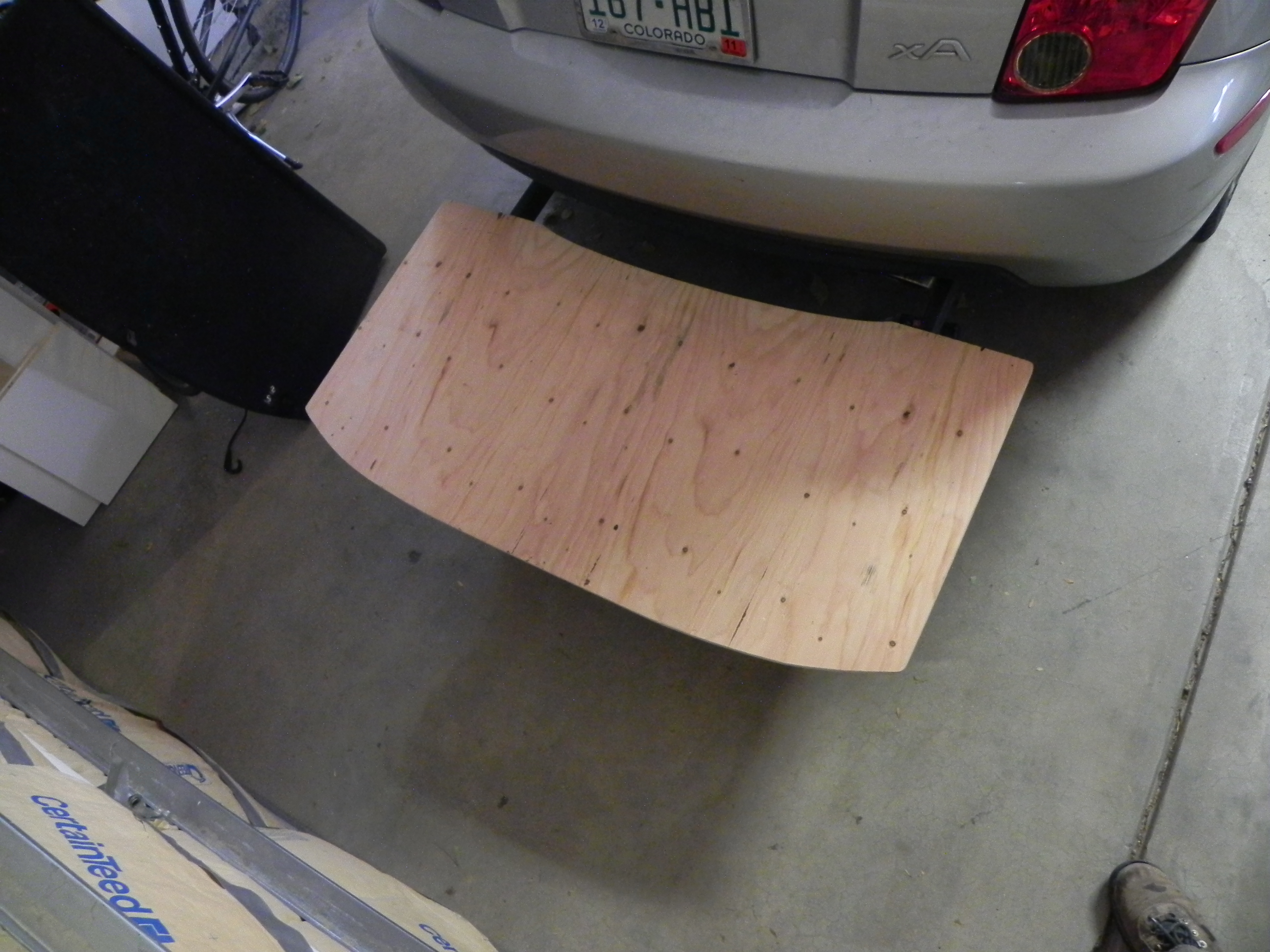 This is the inside view, holding a tent to show the size – I had to cut some shallow slices in the wood (similar to guitar construction) to get it to bend to fit the car