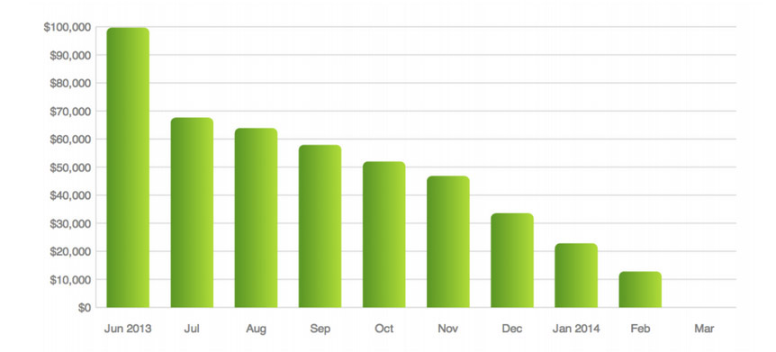 Fast forwarding to the end result: By increasing our earnings a bit and tremendously cutting back on our spending, we were able to make payments towards the loan that ranged from $4k up to $10k each month. This graph (showing the loan balance at the end of each month) illustrates the annihilation of the loan from June 2013 to April 2014: