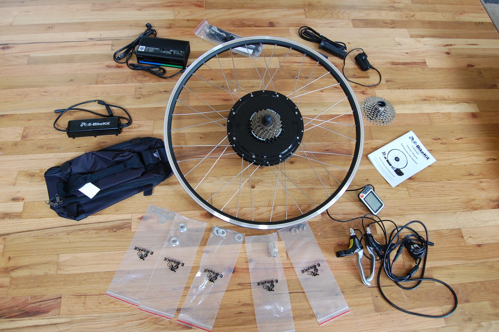 For example, if you search Ebay for “electric bike kit“, you’ll find basic straight-from-China front wheel kits for about $260, then you’d add a 48V Lithium Ion battery for about $400 – $600 with shipping, depending on capacity. The downside is the risk of part failure (and I wouldn’t expect the greatest support if anything breaks), and the need to splice and solder a few wires here and there to get everything to work together.