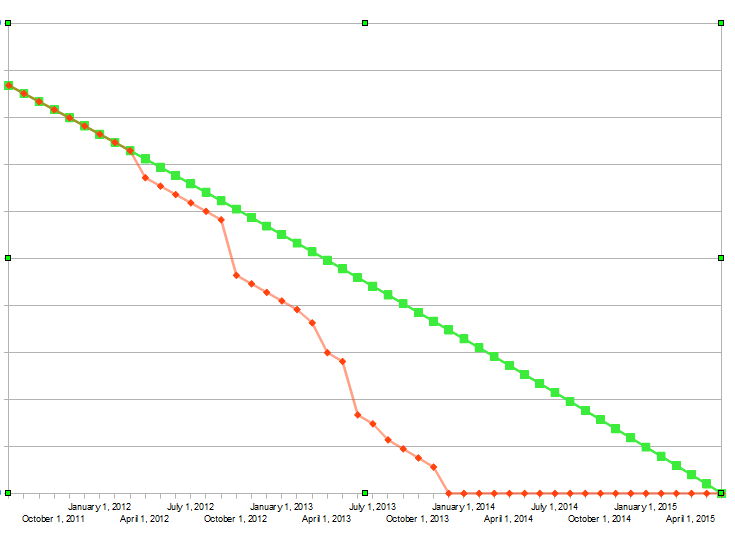 Early retirement wasn’t an entirely real thing, at least in my mind, despite having seen that the Mustache family had clearly achieved it.  Making our mortgage a thing of the past, however, emotionally solidified the mathematics.  The equations and the spreadsheets, like the one you see above, aren’t nearly as tangible until you actually see the descending line hit the x-axis.  Then, very slowly, you realize that the math was a map of the world as it actually exists.  There actually is money piling up in the bank account.