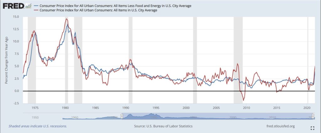 Blue line: same thing but with volatile food and energy prices stripped out.