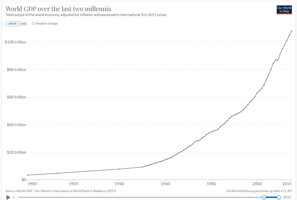 World economic output, even after inflation. What’s your guess at what might happen next? (source: Our World In Data)