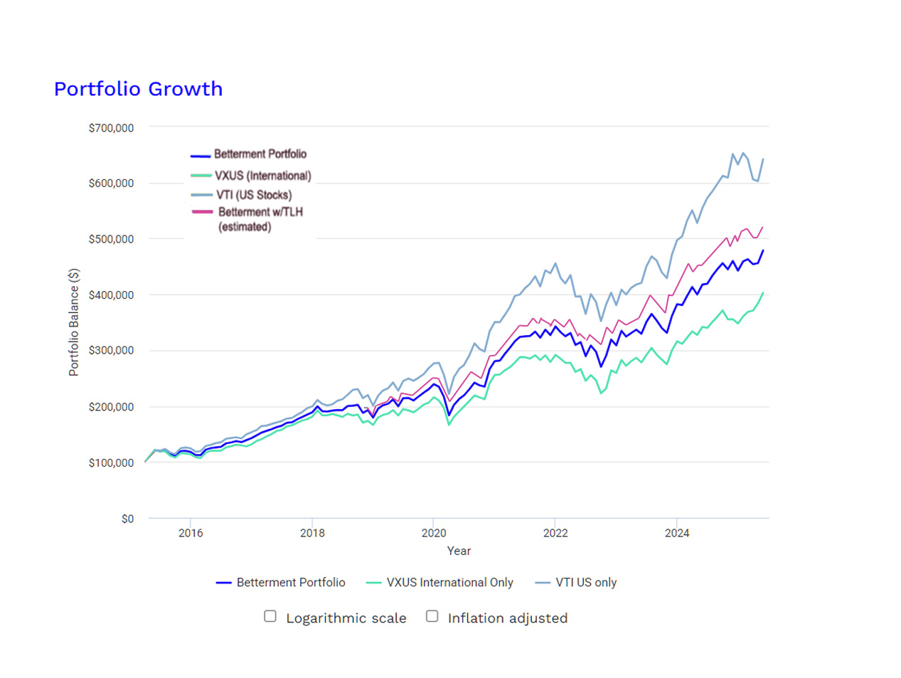 As for betterment. I had to jump out. I put an amount for a year and compared it to my vanguard 2045 target date fund. Betterment was so much lower over the same 1 year time period.
